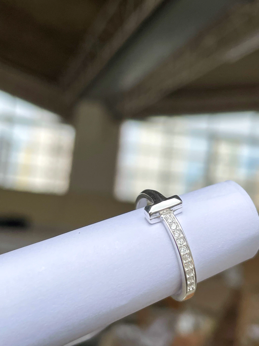 Anel em prata 925 com design em formato “T”, trazendo um visual moderno e minimalista. O aro é meio cravado com zircônias, garantindo brilho delicado sem perder a sofisticação. Ideal para uso diário ou para compor mix de anéis.